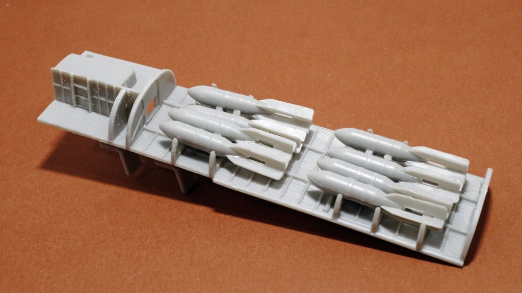 They will be attached to the bomb bay former and inner wings with shackles. The bay former is the heart of the fuselage and seats firmly into gaps in the fuselage’s formers. It essentially spaces the two sides apart. Unfortunately it is a little too wide to do this well, and will need to be sanded severely on both sides.