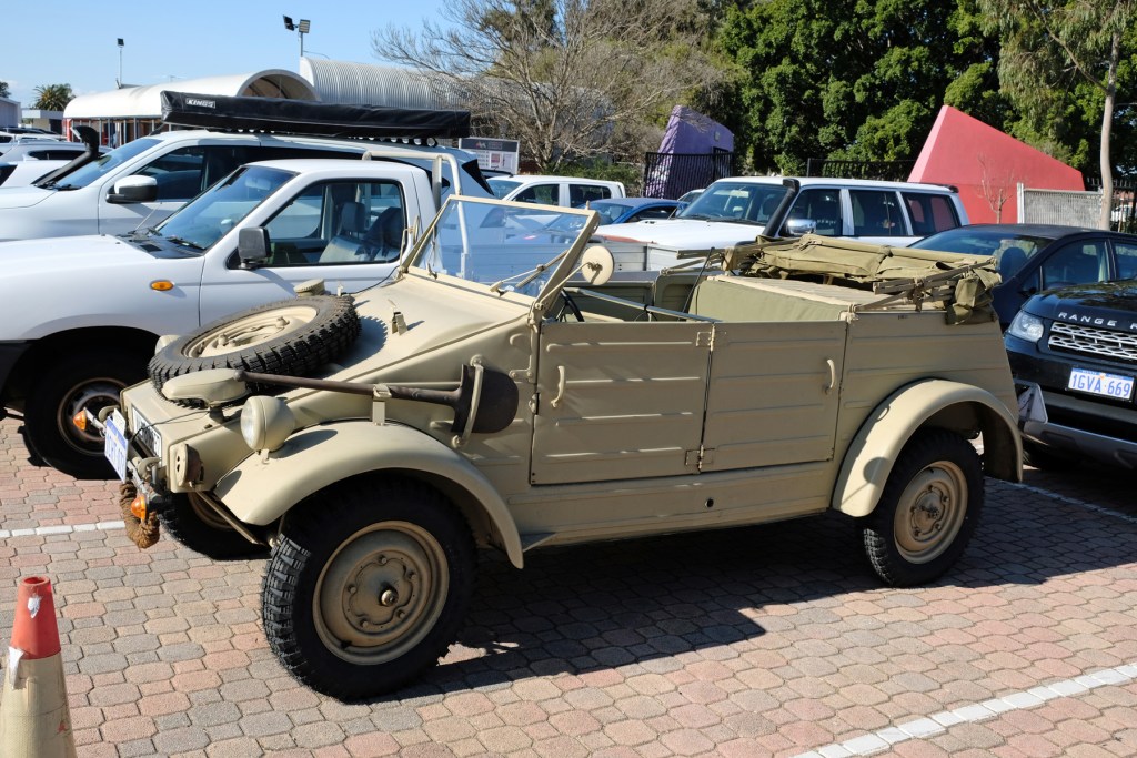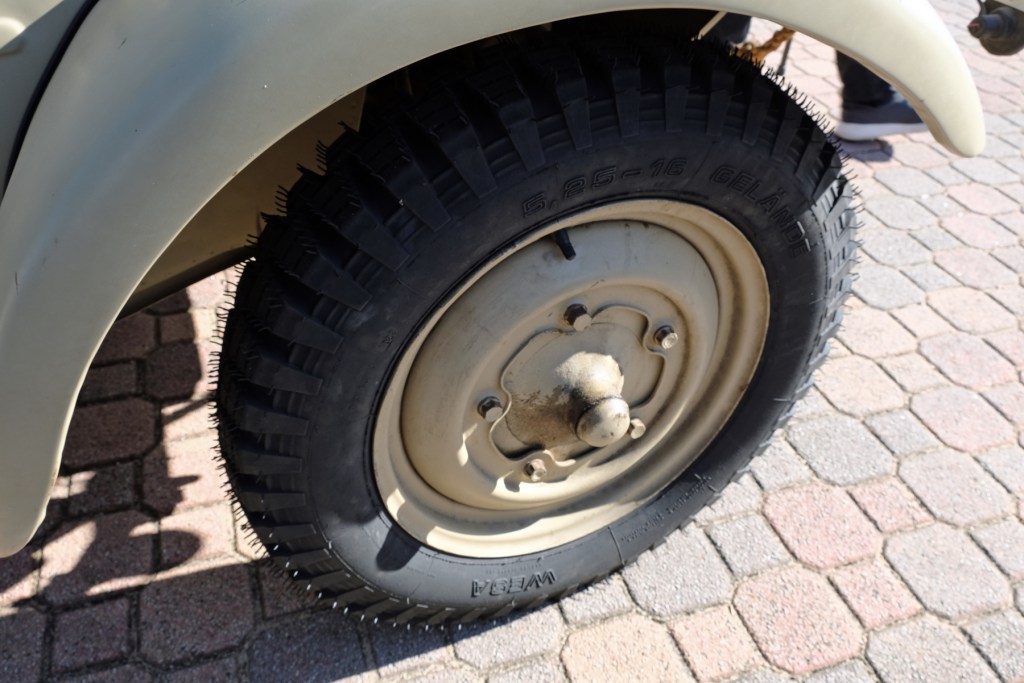The replica is of a German army utility vehicle – a Kubelwagen – of the wartime period. It appears in remarkable preservation…a fact accounted for by its being constructed as a replica in the 1950’s. Apparently it is based upon a Volkswagen chassis or base plate, with the rest of the metalwork and seats being fabricated by the builder.