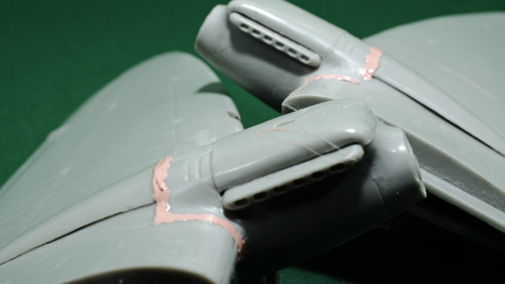 It needs to with this Heinkel, as the fit of both wings and fuselage have more gaps than a Medibank bill. Some take pared-down Plasticard shims and some take the thick Sprue Goo. The thin and thinner Goo for the inevitable little seams.