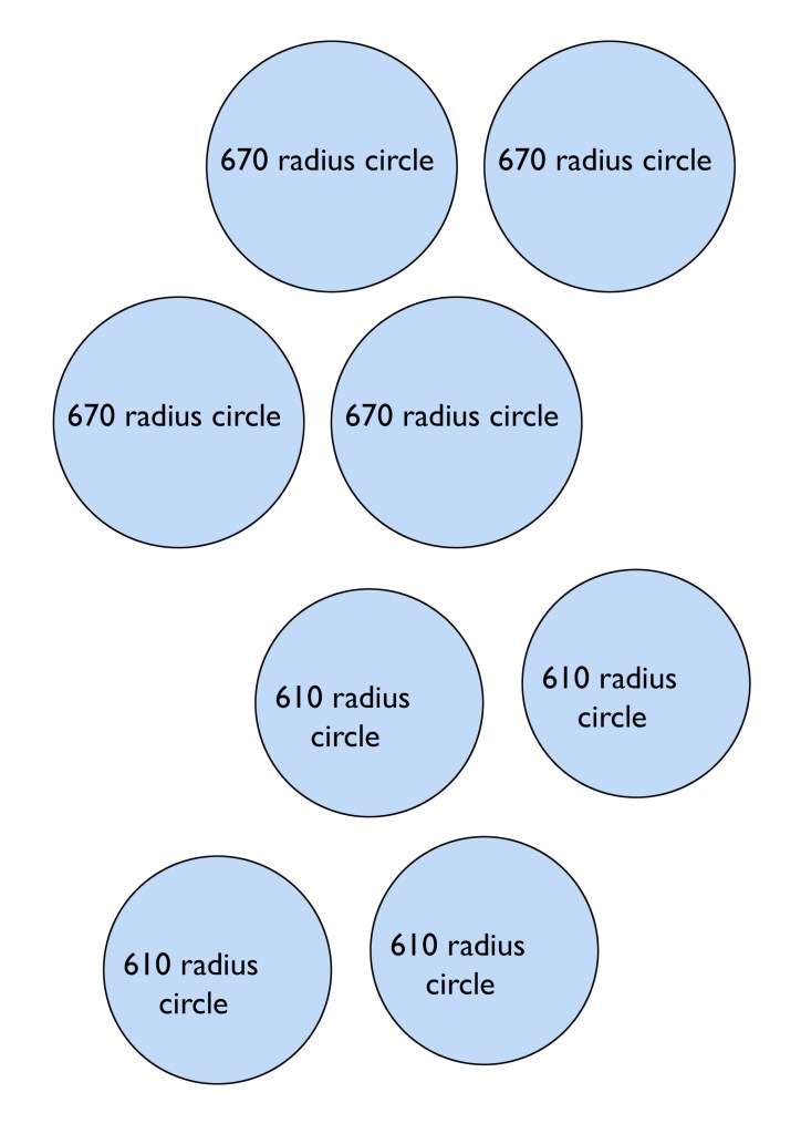 To assess the curved track I make up similar patterns in full circles with the various radii that the track can adopt. I can place these over the trestle table blocks to see if the curves will have enough room.
