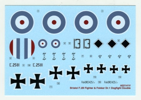 I had been expecting a Fokker triplane as well as a Bristol F.2b that were shown on the box top. Inside the box were decals for both planes, instructions and call-out for both, but no Fokker. Instead I got a second Bristol.